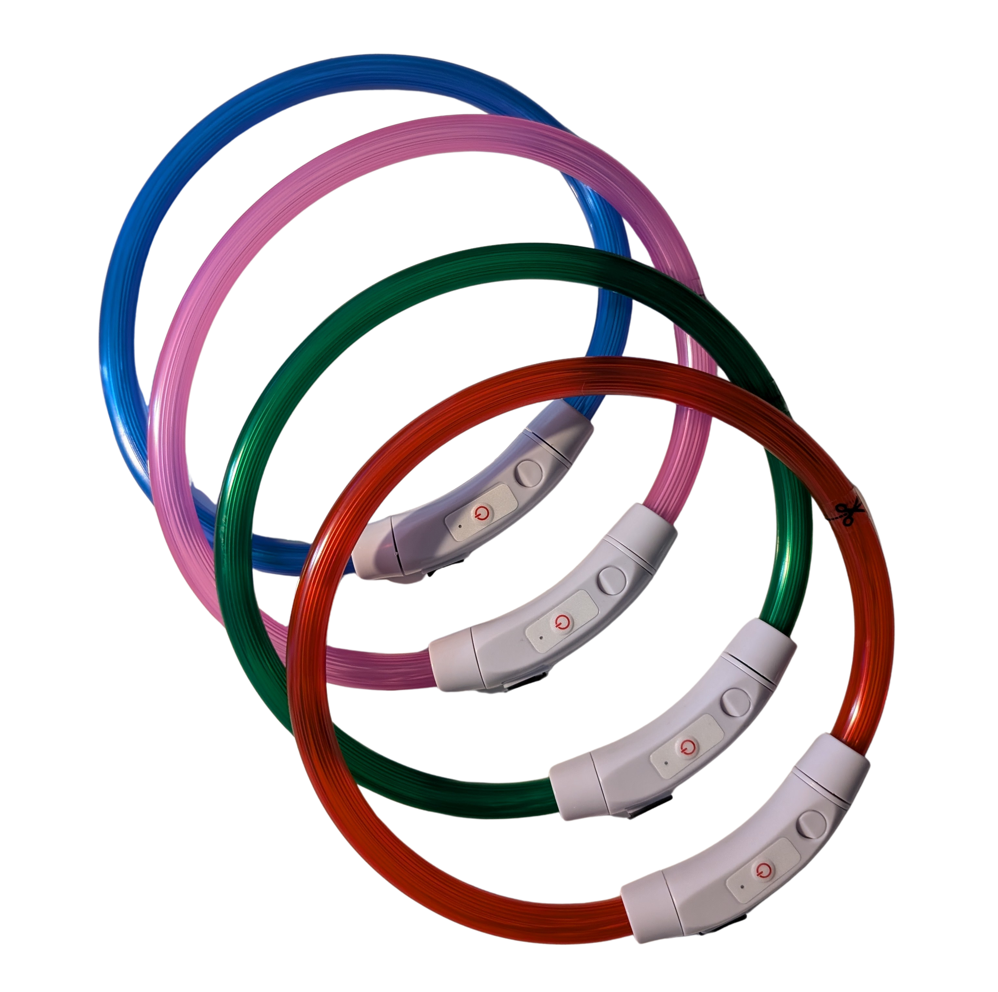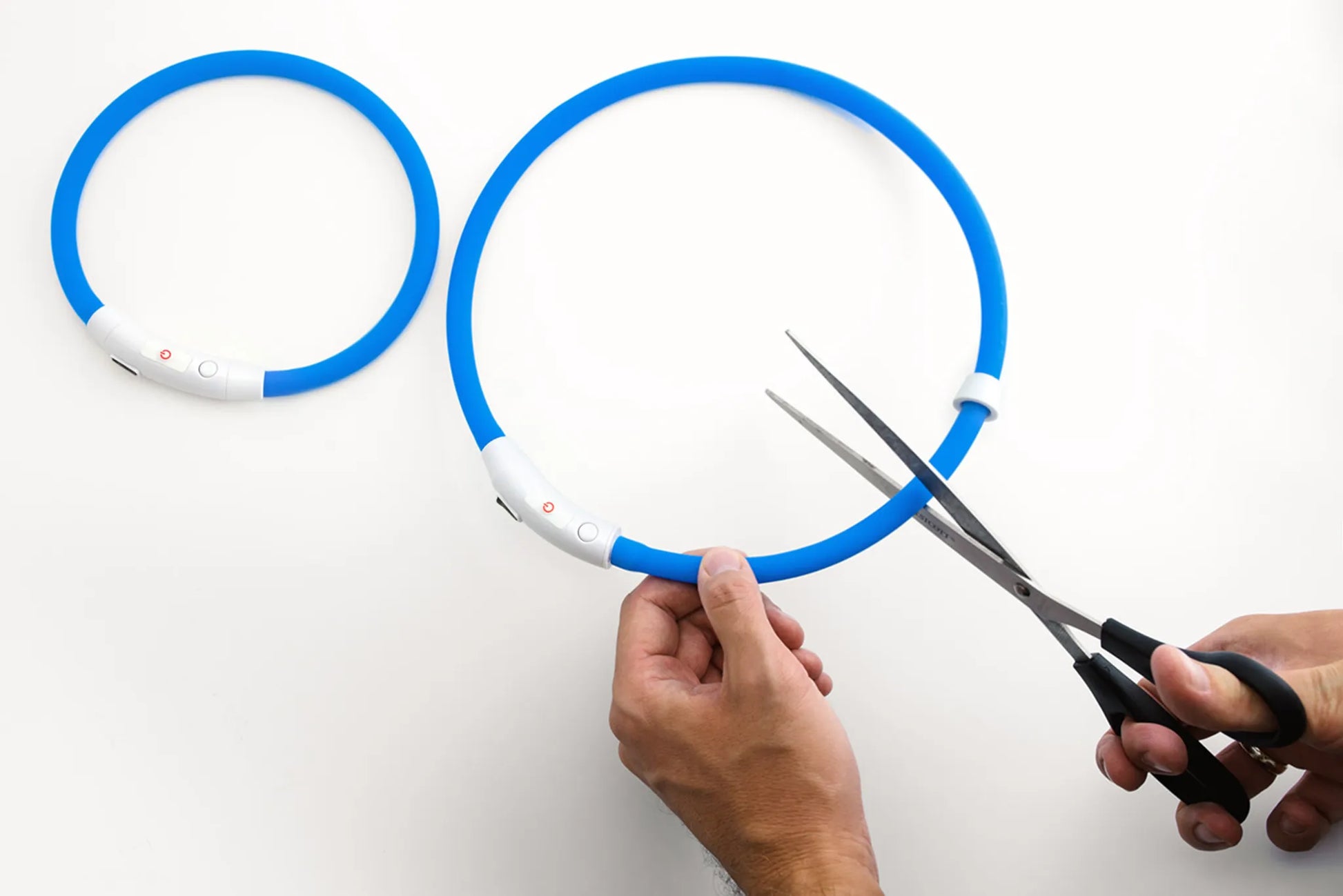 Dieses Leuchthalsband lässt sich leicht in der Länge kürzen, es wird einfach auseinander gezogen, abgeschnitten und wieder eingesteckt.